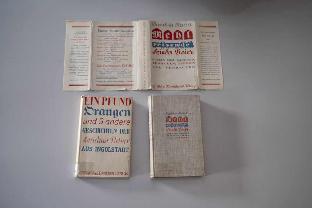 Im Oktober 2021 wurde in Berlin ein Exemplar von Marieluise Fleißers Mehlreisende Frieda Geier. Roman vom Rauchen, Sporteln, Lieben und Verkaufen versteigert. Ausdrücklich heißt es im Auktionskatalog: „(mit SU)“, also mit Schutzumschlag. Der Zuschlag erfolgte für € 2600. Nicht zuletzt wohl deshalb. Eine immerhin signierte Erstausgabe des Romans war dagegen vor einiger Zeit für ‚nur‘ € 280 auf dem Markt. Schon dieser Erstdruck von 1931 im Gustav Kiepenheuer Verlag, Berlin, ist eine Rarität. Das ist auch den Zeitumständen geschuldet. Fleißers Buch taucht auf den „Listen des schädlichen und unerwünschten Schrifttums“ der Nazis nach den Bücherverbrennungen seit dem 10. Mai 1933 auf. Das hat seiner Verbreitung, seiner Aufbewahrung und Sammlung sicher geschadet. Ebenfalls, dass er sich einer kulinarischen Lektüre entzieht. Dass der Roman damit ein Meilenstein, ein ganz spezifisch Ingolstädter Meilenstein der modernen Stadt-Literatur ebenso ist wie Joyces Ulysses ein spezifisch Dubliner Meilenstein, ist heute unstrittig.